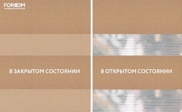 Каждый слой ткани имеет чередующиеся непрозрачные и прозрачные полосы. При смещении полос друг относительно друга можно добиться полного затемнения («ночь», когда непрозрачные полосы совпадают), максимального светопропускания («день», когда совпадают прозрачные полосы) или промежуточных режимов, создавая эффект «зебра».